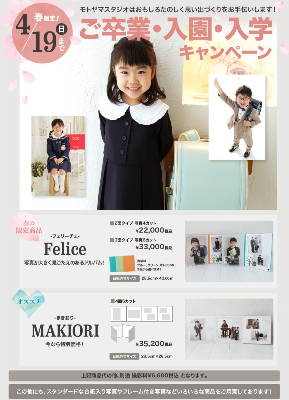 ご卒業・入園・入学 モトヤマスタジオでは 今だけのお得なプランご用意しました! 何かと出費のかさむ季節 なるべく皆様に子供たちの春の良い顔を残して いただきたいと思ってます。 だから普段ではない リーズナブルなプランを 3パターンご用意。 春の門出を写真で!! ページトップへ MOTOYAMA STUDIO (c)2023 株式会社Unlimited Lab