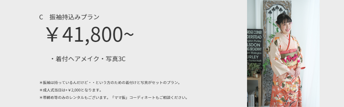 C振袖持込プラン ご自分で持っている振袖を使用してのプラン。写真3枚付き - 着物を着て行くので、写真だけ撮影できますか?