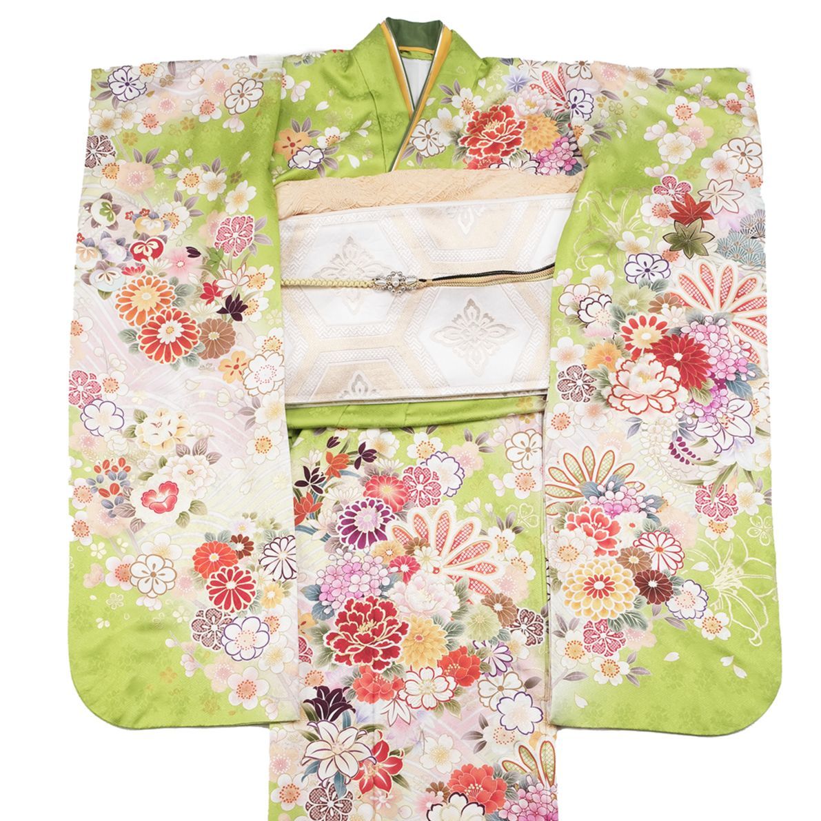 黄緑振袖 帯はシンプル